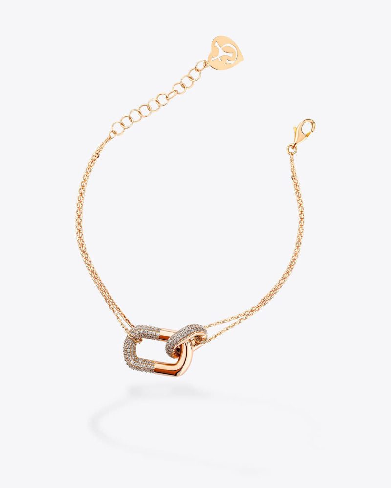 جزئیات ظریف و درخشان کار شده روی حلقه‌های مرکزی، جلوه‌ای لوکس و خاص ایجاد می‌کند که در کنار زنجیر دو لایه طلایی، زیبایی این قطعه را دوچندان ساخته است. طراحی منحصربه‌فرد آن باعث می‌شود چه در استایل روزمره و چه در مهمانی‌های رسمی، بدرخشید.