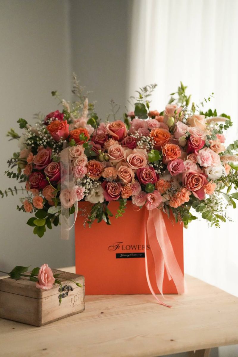 The design of Emilia’s box is such that it inspires a sense of grandeur and luxury at first glance. The orange color of the box, along with the warm and gentle color range of the flowers, adds a different energy and freshness to the surrounding space, making it an ideal choice for special and important occasions.