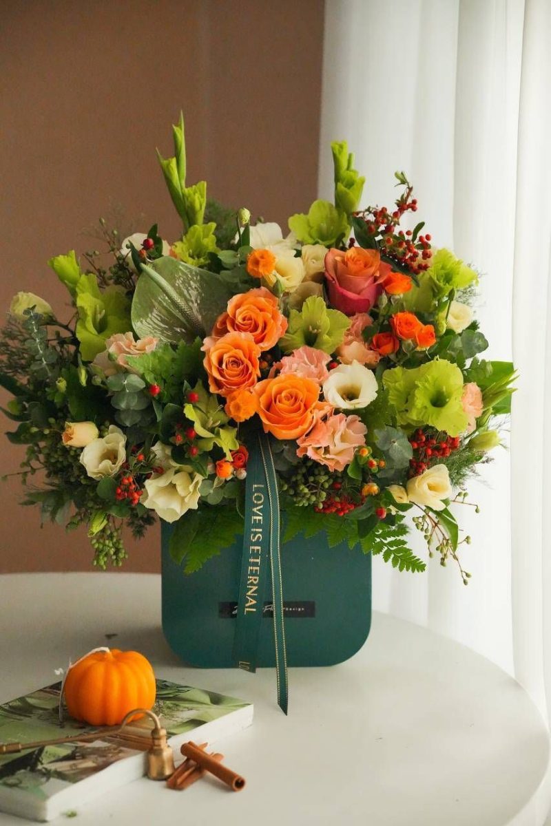 Each flower is carefully selected and artfully placed alongside other natural elements to create a unique harmony of color and form. The vibrant orange roses, delicate pink flowers, and green leaves, along with the stylish dark green packaging, create an attractive and unique combination that will dazzle the eye of any beholder.