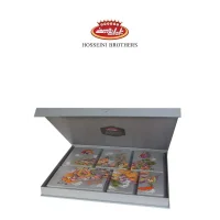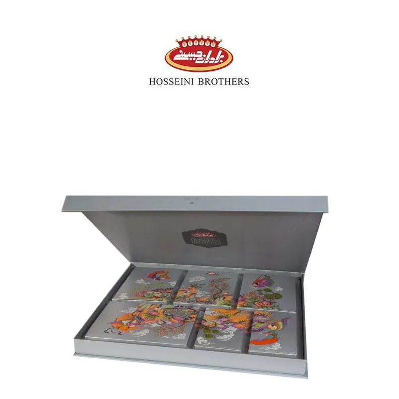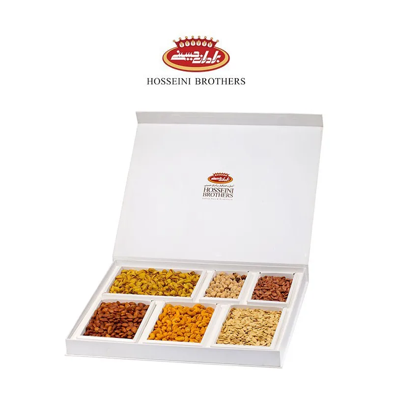 The luxurious “Lily and Majnoon” nut pack from the prestigious Hosseini Brothers brand is a unique choice for those looking for a stylish yet delicious gift. With its unique design and minimal white packaging, this pack has a very luxurious and eye-catching appearance, making it an ideal choice for gatherings, parties, and special gifts.