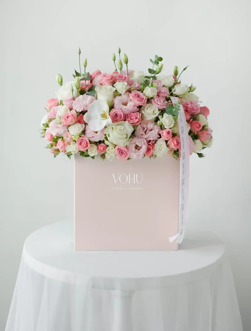 Martha’s Flower Box from Vohu is a delightful combination of elegance, tenderness, and natural beauty that conveys a romantic and relaxing feeling with its stylish design and unique color scheme. This box is designed with an artistic floral arrangement of pink and white roses, along with delicate blossoms and seasonal flowers. The harmony of these colors displays an atmosphere of intimacy, purity, and pure love.