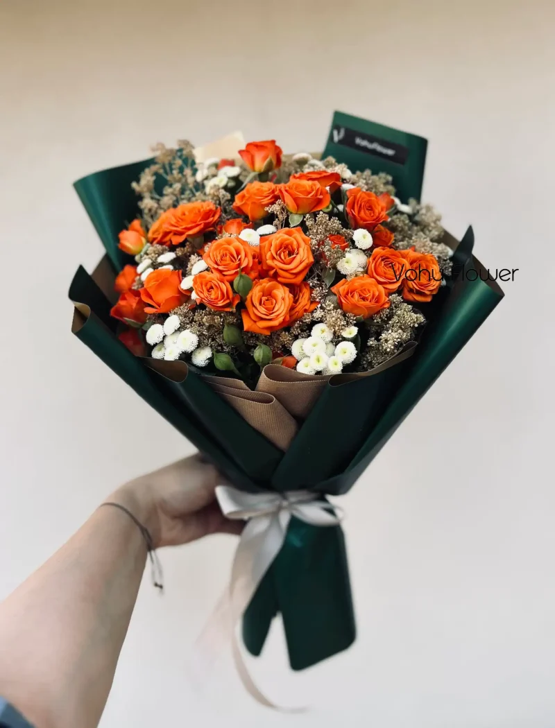 Vohu’s Mini Orange Rose Bouquet is full of energy, warmth, and zest for life. The combination of bright, vibrant orange roses with small white flowers and delicate blooms creates an image full of excitement and joy. Orange symbolizes passion, creativity, and deep friendship, making this bouquet the best choice for a different and energetic gift.